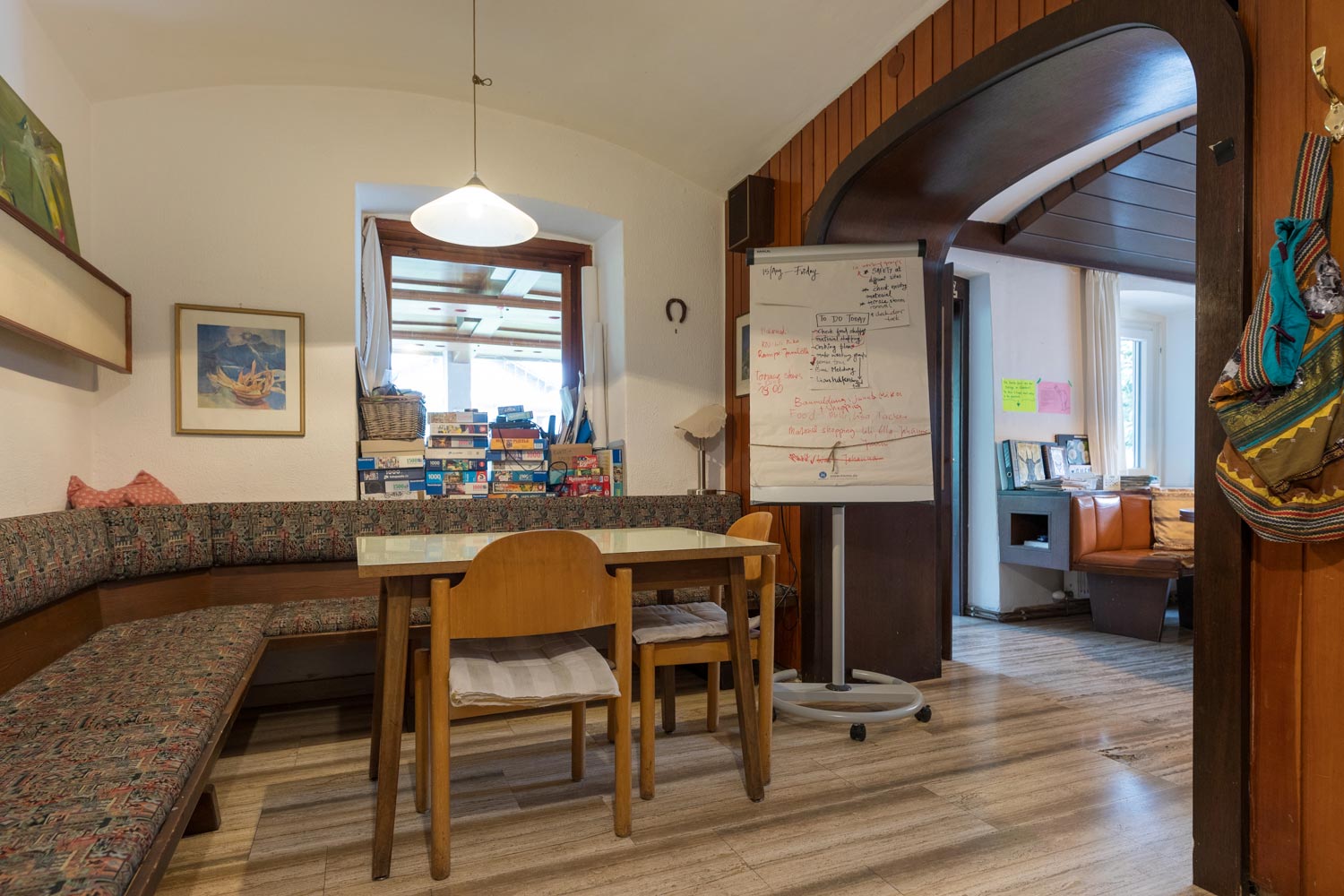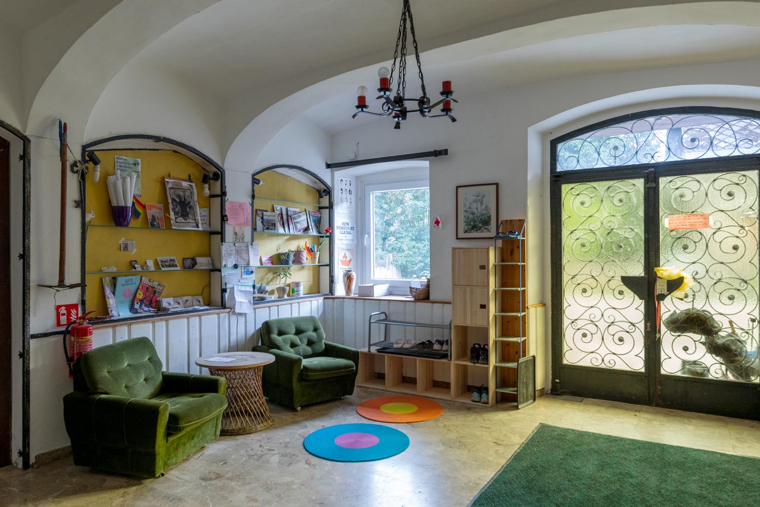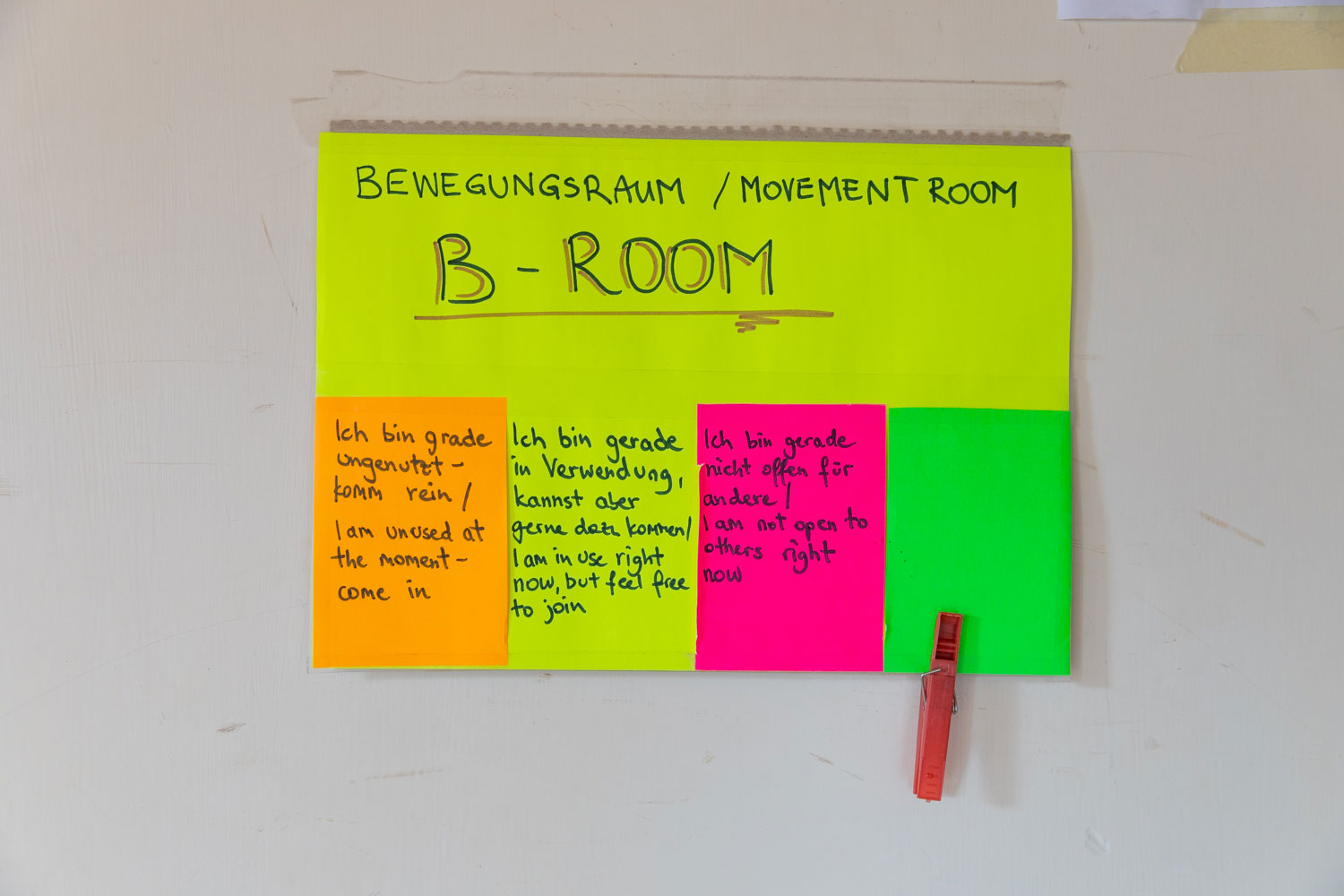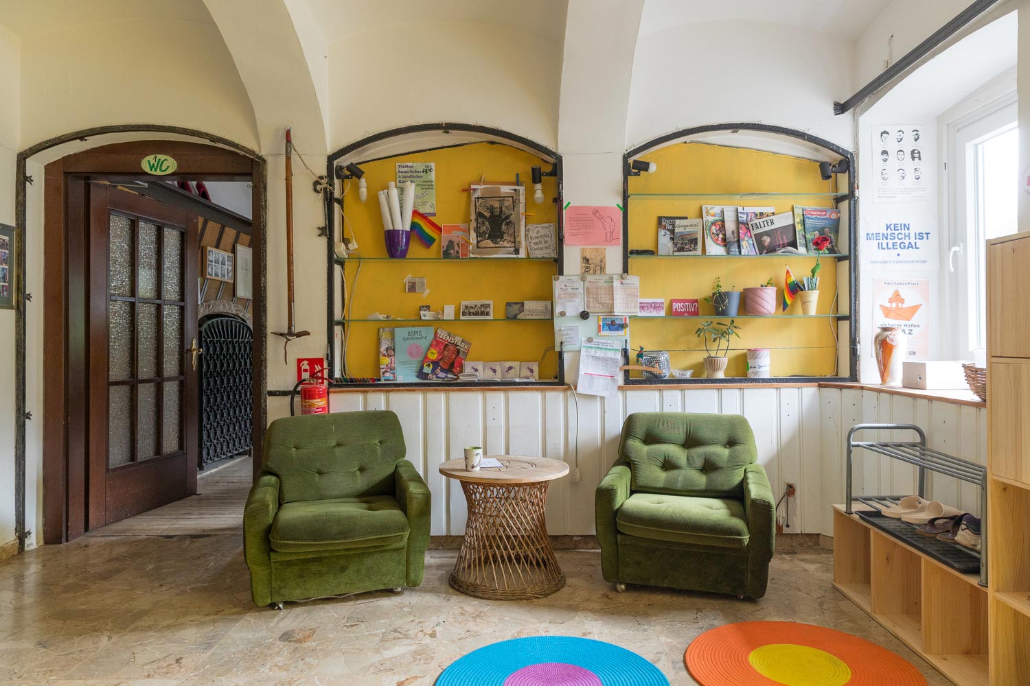 Gemeinschaftsräume ÜbersichtSaalb-Room (Bewegungsraum)FoyerBar und StüberlWintergartenBibliothekTerrasseKüchefrei:räumchenÜbersicht RaumpläneX Erdgeschoß 1. Obergeschoß 2. Obergeschoß Saal b-Room (Bewegungsraum) Foyer Bar und Stüberl Wintergarten Bibliothek Terrasse Küche frei:räumchen Saal NutzungKonzerte, Filmscreenings, Parties, Feiern, Theater, Ausstellung, Seminargruppen, TanzAusstattungStühle, Bühne, Bühnenlicht, PV-Anlage, Backstageraum, Leinwand, Zentralheizung, verdunkelbare FensterBarrierenRaum ist über Rampe oder Lift barrierefrei zugänglich, barrierefreies Bad und WC im gleichen Stockwerk (Zimmer 4) b-Room (Bewegungsraum) Nutzungfür Sport, Bewegung, Körperarbeit aller Art, Seminargruppen, TanzAusstattungKork Schwingboden, Zentralheizung, Matten, Decken, Sitzpölster, Hanteln, Gummibänder, Blackroll, Massageliege, Boxsack, BoxhandschuheBarrierenRaum ist über Rampe oder Lift barrierefrei zugänglich, barrierefreies Bad und WC im gleichen Stockwerk (Zimmer 4) Foyer NutzungEingangsbereich, Garderobe, Go-Mobil-Tickets, Lost-and-FoundAusstattung2 Sofasessel und Tisch, Erstehilfekasten, Feuerlöscher, Lost-and-Found-RegalBarrierenRaum ist über Rampe barrierefrei zugänglich, Zugang zum Lift Bar und Stüberl NutzungAufenthaltsräume für Essen, Spielen, Kaffe-/Teetrinken, Puzzlen uvm.Ausstattung2 runde Tische mit runden Bänken, 2 eckige Tische im Stüberl, ZentralheizungBarrierenRaum ist über Rampe barrierefrei zugänglich, kein barrierefreies Bad im Stockwerk Wintergarten NutzungEssen, Spielen, Filmscreenings, Aufenthaltsraum, Wohnzimmer, SeminargruppenAusstattungTische, Stühle, Sofas, Flipchart, Pinwände, Beamer, ZentralheizungBarrierenRaum ist über Rampe barrierefrei zugänglich, kein barrierefreies Bad im Stockwerk Bibliothek NutzungBücher vor Ort lesenAusstattungBücher, Sitzgelegenheiten, Tische, Sofa, ZentralheizungBarrierenzweistufige Treppe vom Wintergarten zum Bibliotheksbereich, kein barrierefreies Bad und WC im Stockwerk Terrasse NutzungEssen, Lesen, RelaxenAusstattungTische, SofaBarrierenStufe Küche NutzungKochen, Lagermöglichkeit für LebensmittelAusstattungGastroküche, Kühlschränke, SpülmaschineBarrierenüber Rampe barrierefrei zugänglich, nicht unterfahrbar frei:räumchen NutzungKostnix-Bereich (Kleider/Dinge, die du nicht mehr brauchst bringen und nehmen, ohne Bezahlung), Ausstellungen AusstattungSitzgelegenheit mit Tisch, keine ZentralheizungBarrierenvon außen über Rampe zugänglich, vom Foyer nur über zweistufige Treppe zugänglich, kein barrierefreies Bad und WC im Stockwerk