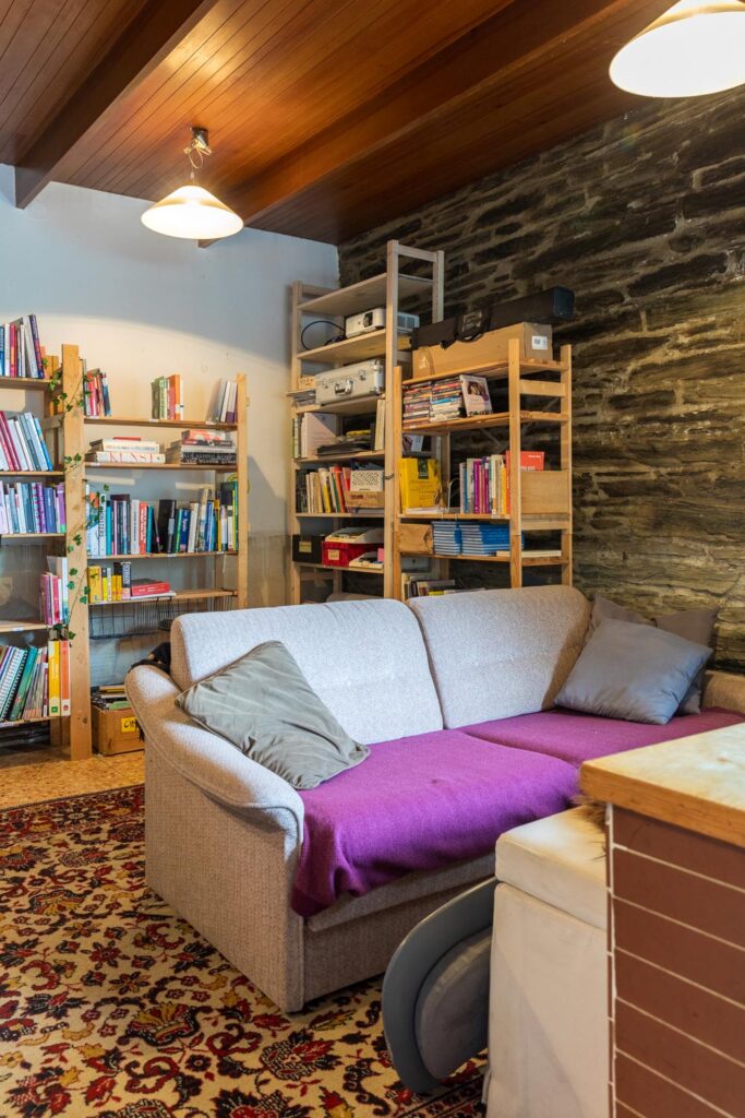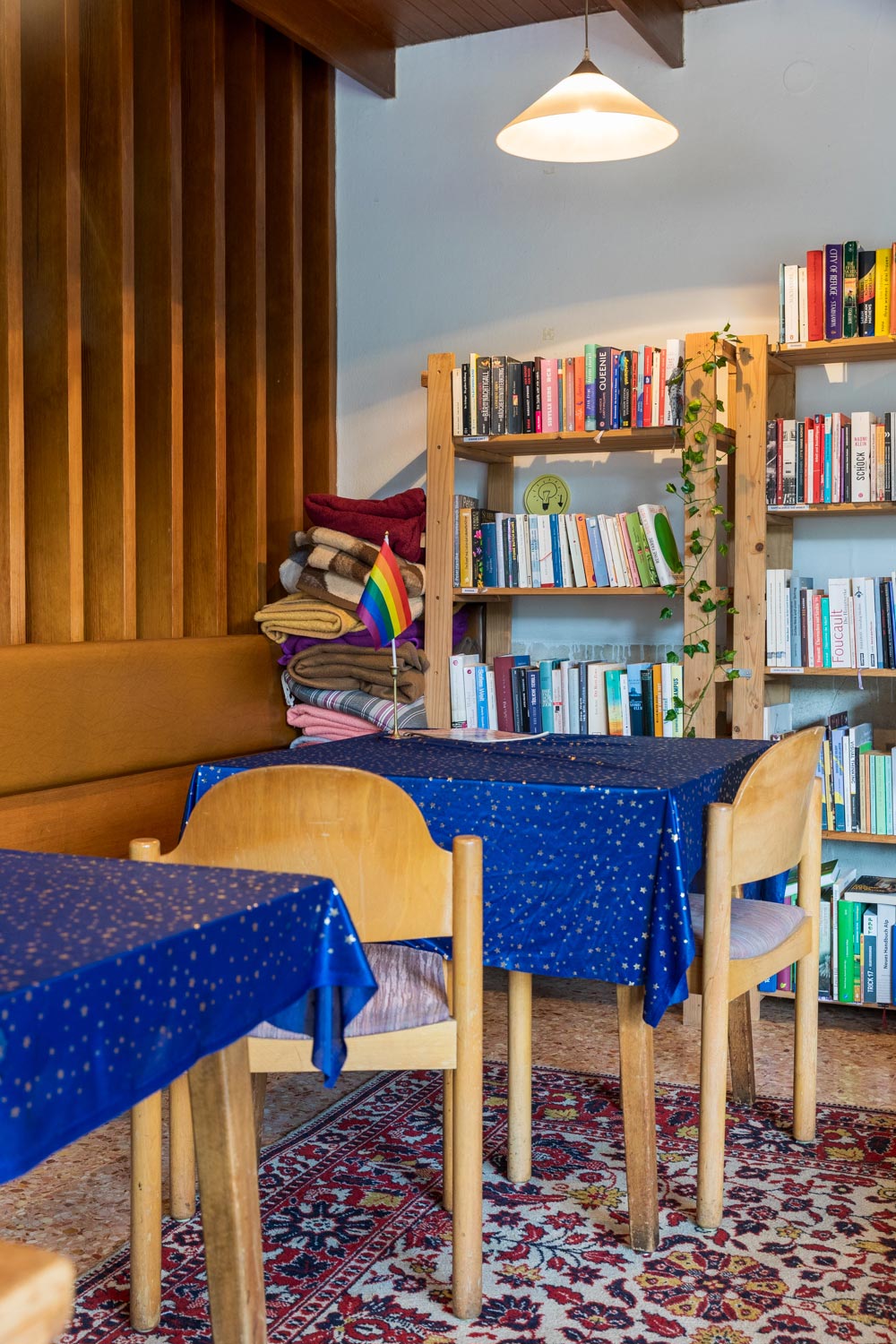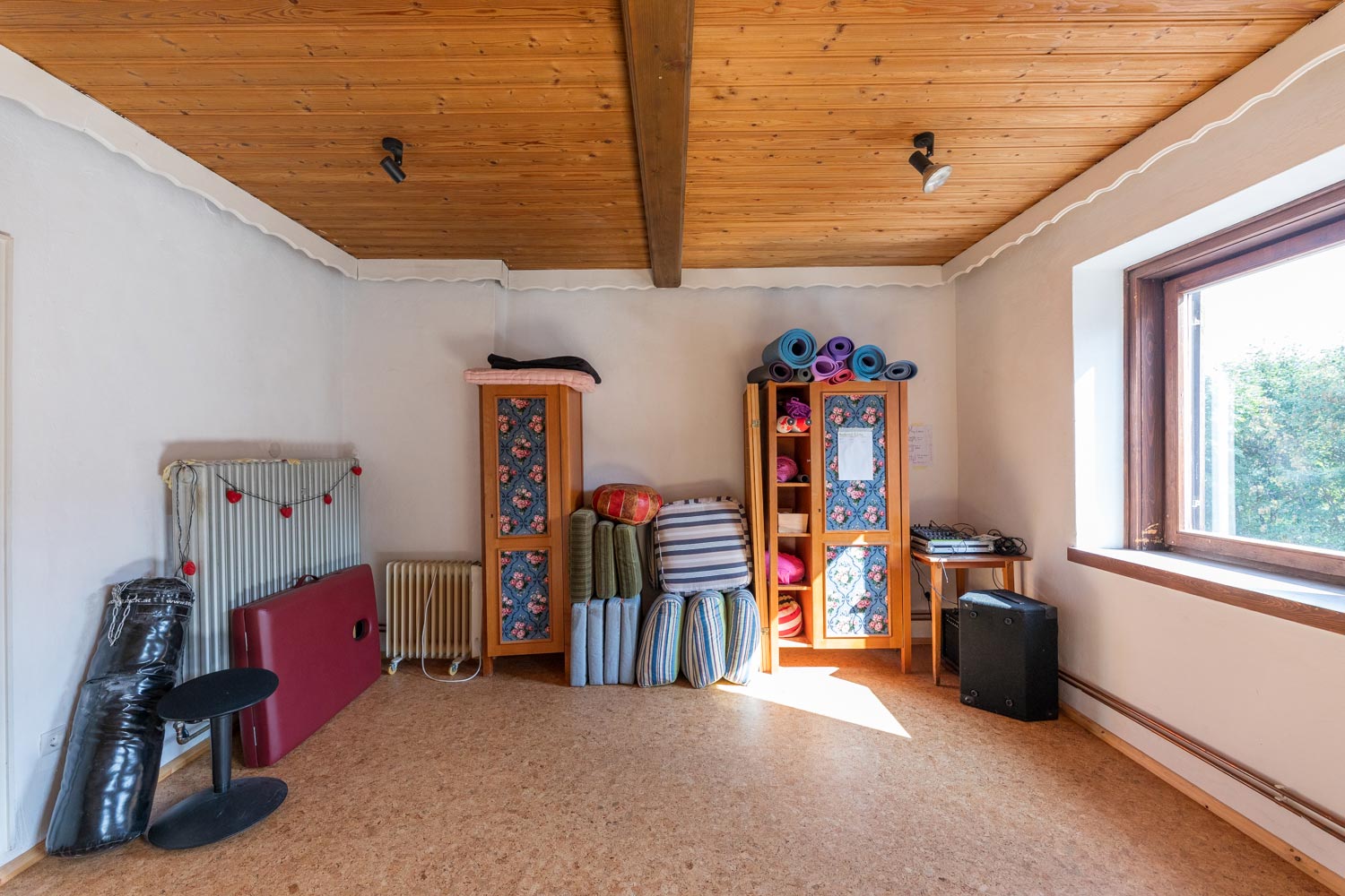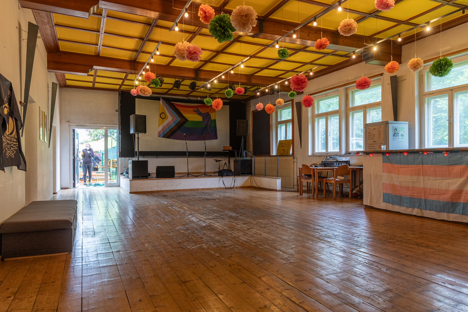 Gemeinschaftsräume ÜbersichtSaalb-Room (Bewegungsraum)FoyerBar und StüberlWintergartenBibliothekTerrasseKüchefrei:räumchenÜbersicht RaumpläneX Erdgeschoß 1. Obergeschoß 2. Obergeschoß Saal b-Room (Bewegungsraum) Foyer Bar und Stüberl Wintergarten Bibliothek Terrasse Küche frei:räumchen Saal NutzungKonzerte, Filmscreenings, Parties, Feiern, Theater, Ausstellung, Seminargruppen, TanzAusstattungStühle, Bühne, Bühnenlicht, PV-Anlage, Backstageraum, Leinwand, Zentralheizung, verdunkelbare FensterBarrierenRaum ist über Rampe oder Lift barrierefrei zugänglich, barrierefreies Bad und WC im gleichen Stockwerk (Zimmer 4) b-Room (Bewegungsraum) Nutzungfür Sport, Bewegung, Körperarbeit aller Art, Seminargruppen, TanzAusstattungKork Schwingboden, Zentralheizung, Matten, Decken, Sitzpölster, Hanteln, Gummibänder, Blackroll, Massageliege, Boxsack, BoxhandschuheBarrierenRaum ist über Rampe oder Lift barrierefrei zugänglich, barrierefreies Bad und WC im gleichen Stockwerk (Zimmer 4) Foyer NutzungEingangsbereich, Garderobe, Go-Mobil-Tickets, Lost-and-FoundAusstattung2 Sofasessel und Tisch, Erstehilfekasten, Feuerlöscher, Lost-and-Found-RegalBarrierenRaum ist über Rampe barrierefrei zugänglich, Zugang zum Lift Bar und Stüberl NutzungAufenthaltsräume für Essen, Spielen, Kaffe-/Teetrinken, Puzzlen uvm.Ausstattung2 runde Tische mit runden Bänken, 2 eckige Tische im Stüberl, ZentralheizungBarrierenRaum ist über Rampe barrierefrei zugänglich, kein barrierefreies Bad im Stockwerk Wintergarten NutzungEssen, Spielen, Filmscreenings, Aufenthaltsraum, Wohnzimmer, SeminargruppenAusstattungTische, Stühle, Sofas, Flipchart, Pinwände, Beamer, ZentralheizungBarrierenRaum ist über Rampe barrierefrei zugänglich, kein barrierefreies Bad im Stockwerk Bibliothek NutzungBücher vor Ort lesenAusstattungBücher, Sitzgelegenheiten, Tische, Sofa, ZentralheizungBarrierenzweistufige Treppe vom Wintergarten zum Bibliotheksbereich, kein barrierefreies Bad und WC im Stockwerk Terrasse NutzungEssen, Lesen, RelaxenAusstattungTische, SofaBarrierenStufe Küche NutzungKochen, Lagermöglichkeit für LebensmittelAusstattungGastroküche, Kühlschränke, SpülmaschineBarrierenüber Rampe barrierefrei zugänglich, nicht unterfahrbar frei:räumchen NutzungKostnix-Bereich (Kleider/Dinge, die du nicht mehr brauchst bringen und nehmen, ohne Bezahlung), Ausstellungen AusstattungSitzgelegenheit mit Tisch, keine ZentralheizungBarrierenvon außen über Rampe zugänglich, vom Foyer nur über zweistufige Treppe zugänglich, kein barrierefreies Bad und WC im Stockwerk