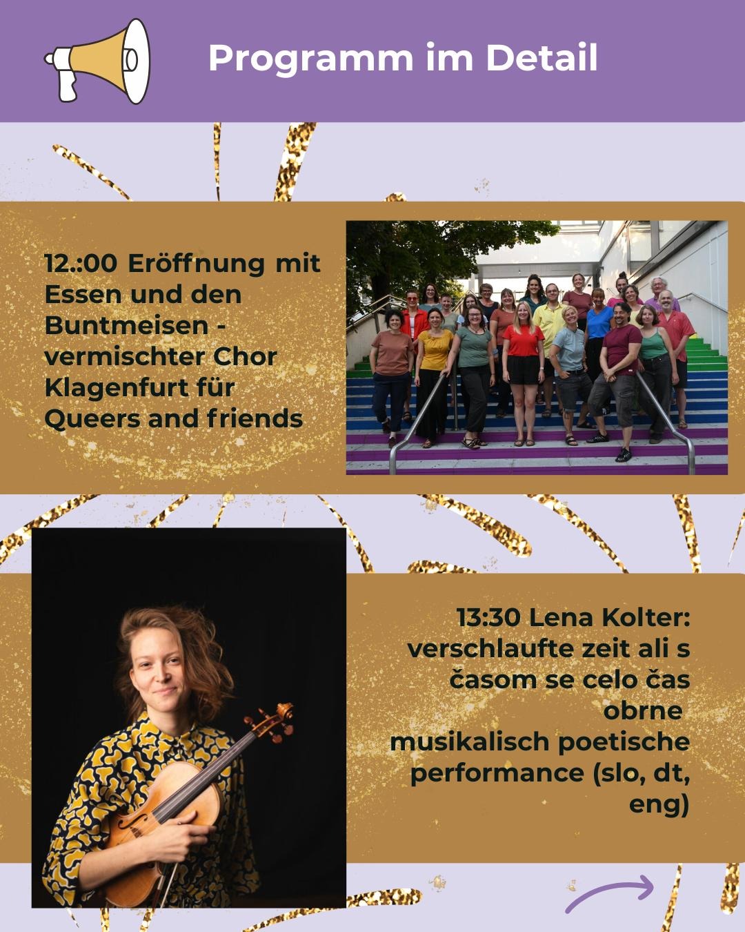 12:00 Eröffnung mit Essen und den Buntmeisen – vermischter Chor aus Klagenfurt für Queers and friends