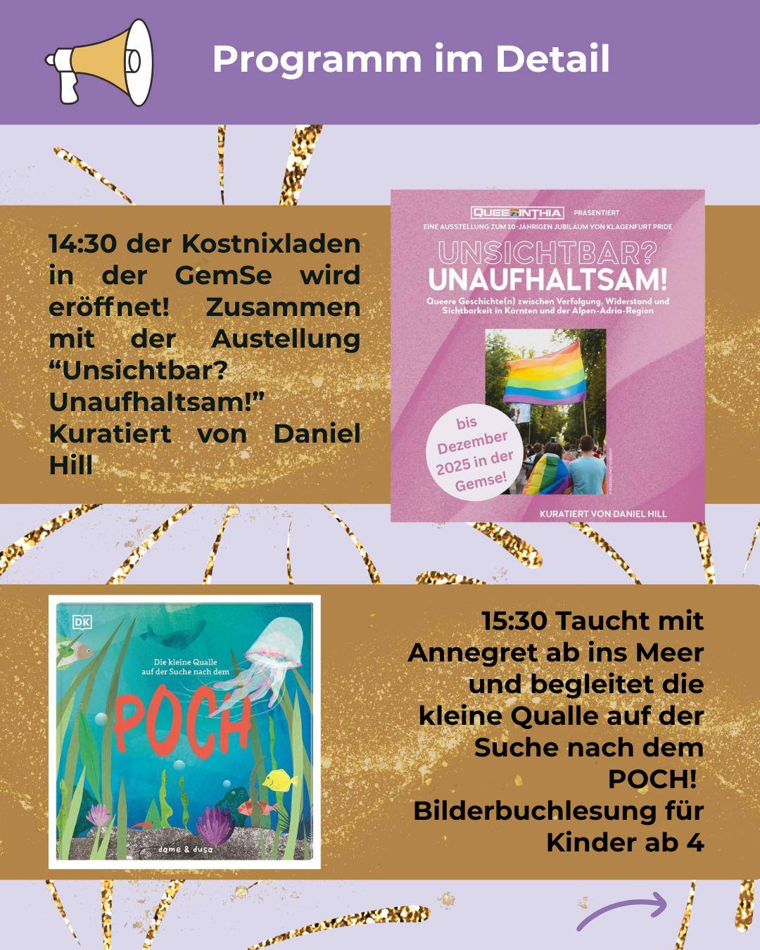 14:30 der Kostnixladen in der GemSe wird eröffnet! Zusammen mit der Ausstellung „Unsichtbar Unaufhaltsam!“ Kuratiert von Daniel Hill