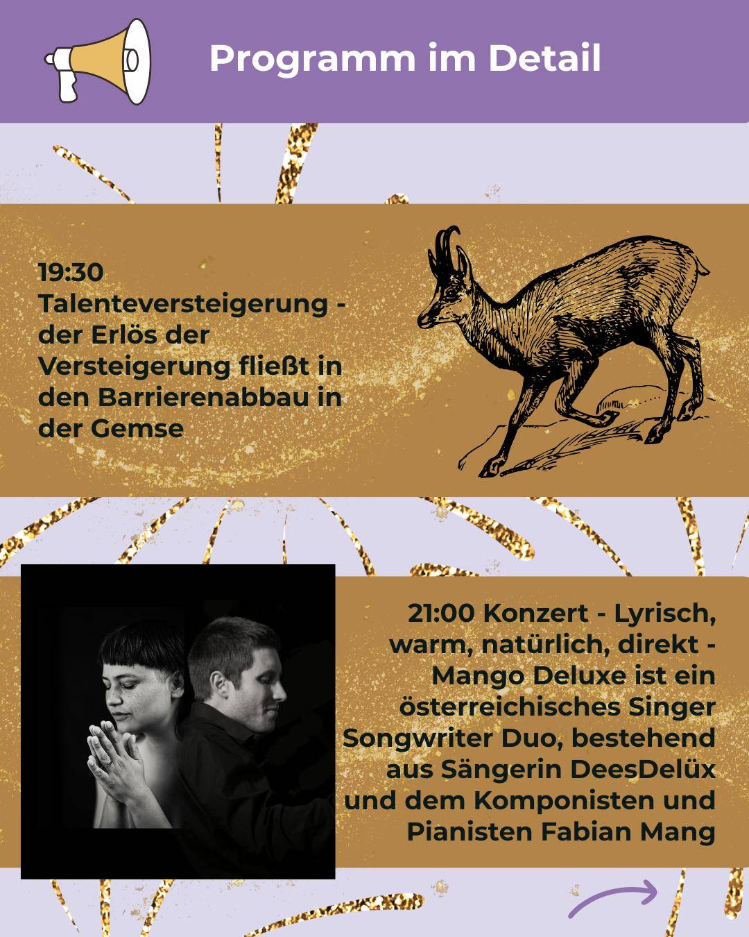 21:00 Konzert – Lyrisch, warm, natürlich, direkt – Mango Deluxe ist ein österreichisches Singer Songwriter Duo, bestehend aus Sängerin DeesDelüx und dem Komponisten und Pianisten Fabian Mang
