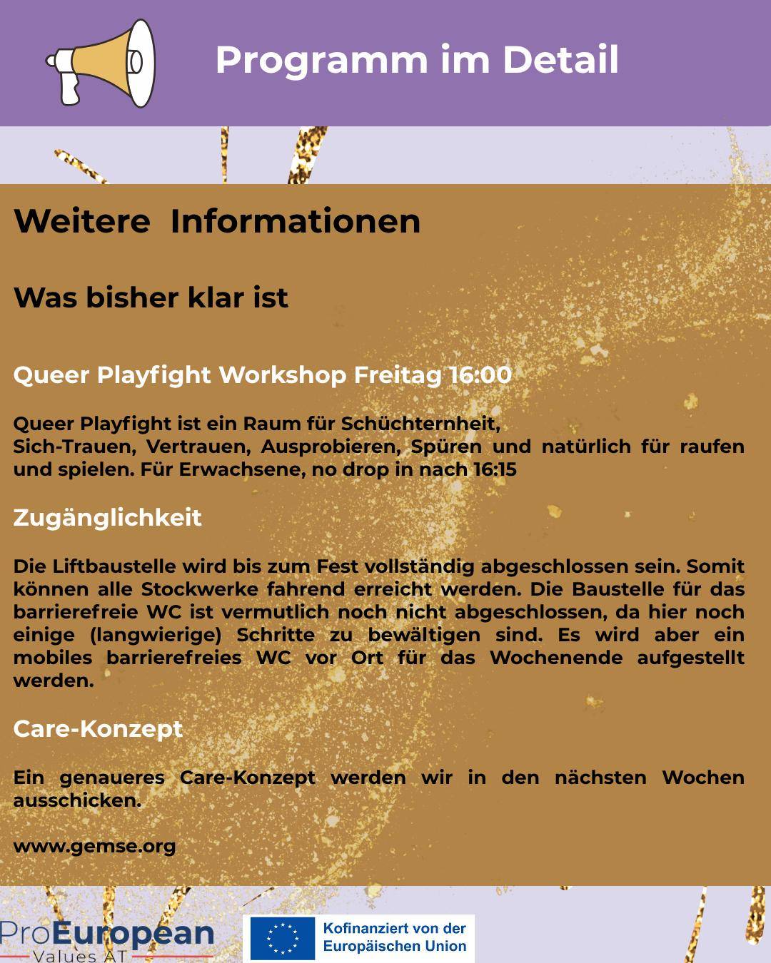 Zugänglichkeit: Die Liftbaustelle wird bis zum Fest vollständig abgeschlossen sein. Somit können alle Stockwerke fahrend erreicht werden. Die Baustelle für das barrierefreie WC ist vermutlich noch nicht abgeschlossen, da hier noch einige (langwierige) Schritte zu bewältigen sind. Es wird aber ein mobiles barrierefreies WC vor Ort für das Wochenende aufgestellt werden.