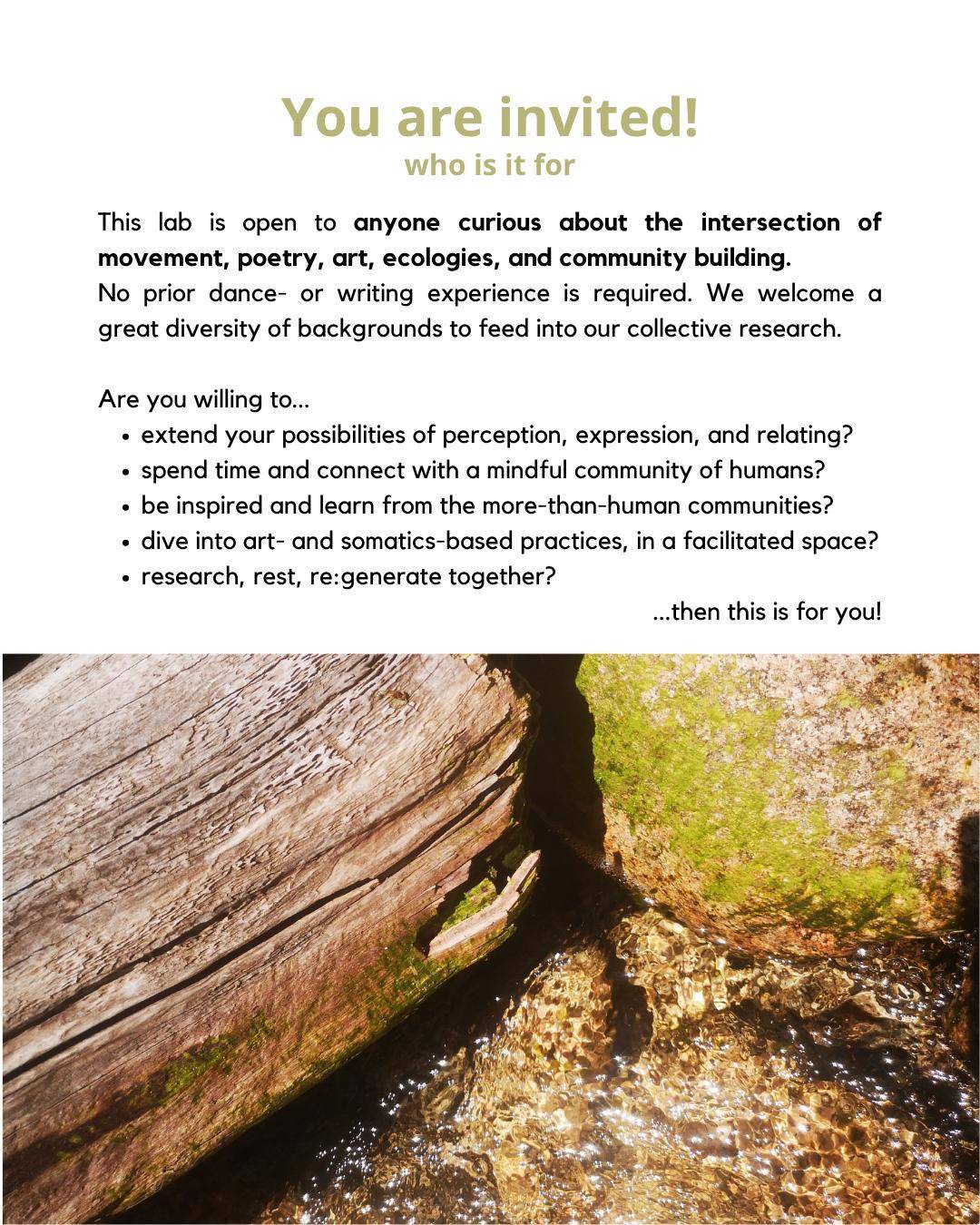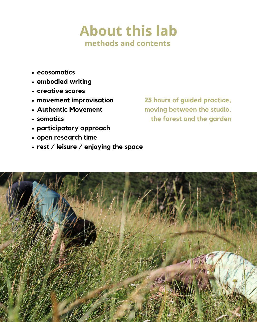 A 5-day lab in which we’ll move between garden, forest, and studio to explore how ecosomatics, (co-)creative moving- and writing practices can inspire re:generative ways of relating amongst and beyond humans. What can we learn from being_with snails, trees, compost and co., on an embodied level, about and for our entanglements? How can we build re:generative communities,